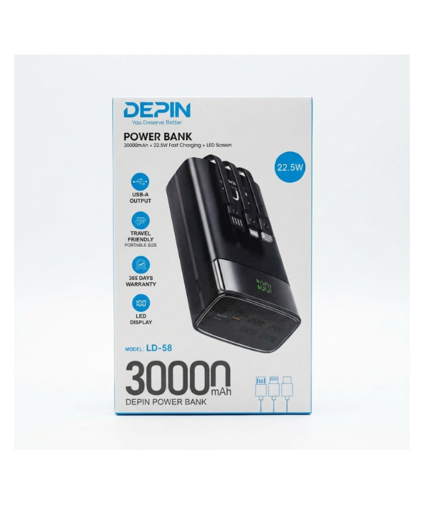 DEPIN Power Bank LD-58, 30 000mAh, 22.5W Fast Charging, LED Display, câbles intégrés, finition noire